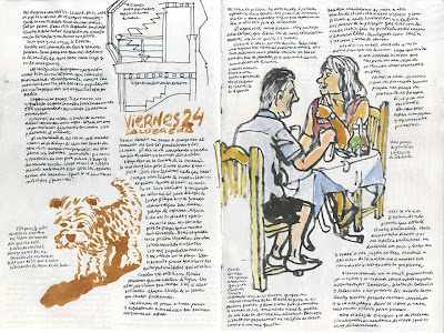 La churrería del mercado de Salobreña tiene unos churros de forma irregular con poca grasa y riquísimos. Como va tanta gente, tienen sus propias normas. Es inútil pedir nada hasta que hayan despachado al anterior. Uno se mantiene en silencio hasta que la camarera te pregunta qué quieres. Una vez comprendido este asunto, me siento en una banqueta y saco mi cuaderno esperando mi turno. Cuando llega mi pedido dejo la labor y mojo los churros en el café, dejando la taza a la mitad para acabar mi tarea. En esto que llega un cagaprisas resabiondo de esos que se traen las leyes de su barrio y se pone detrás de mí, insistiendo en pedir su comanda a destiempo. Me pregunta si he terminado, viendo mediada la taza, y hace unos extraños sonidos jugando con el aire en su boca. Me dice que esto no es un colegio, ni la barra un pupitre, que deje sitio a los demás, refiriéndose a él mismo, en vez de ocupar la barra con mi cuaderno. Le digo que, que yo sepa, no está prohibido dibujar en los bares. En este lance, la churrera deja sudorosa de freír, se asoma por la ventanilla de servicio y sale rauda por la puerta. Se acerca a mí y con voz alta me dice: puedes estar todo el día dibujando si quieres, el negocio es mío. Y a los churros, estás invitado.
