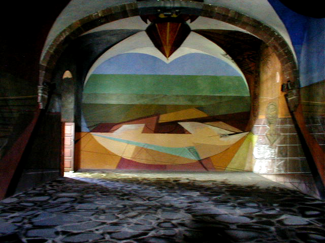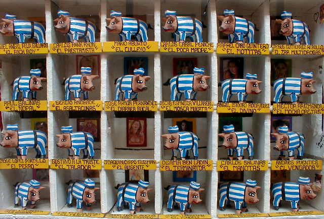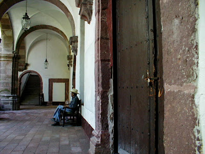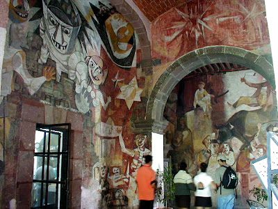 Entre guiris de la tercera edad, vemos la iglesia y convento de San Antonio, San Felipe Neri, San Francisco con su fachada churrigueresca, el Jardín de los arcos con sus refrescantes laureles chinos y La Parroquia que, cuentan, hizo un albañil autodidacta que dibujaba sus cambiantes planos sobre la arena. Después de ver la casa de Ignacio Allende, comemos en un fresco patio, empedrado y lleno de plantas, suflé de calabaza, crema de maíz, conejo al vino tinto y chile relleno. Sospechamos del conejo, de grandes costillas y sabor disimulado. Beni piensa que me han dado gato por liebre. Me acuerdo de esos perros sarnosos que recogían con acerado lazo y ahí se queda, me como los frijoles y un bizcocho de manzana y pasas con licor. Descansamos en el selvático y descuidado Parque Juárez. Todo queda mermado ante la escuela de arte, precioso edificio, que fuera un convento, alrededor de un gran patio. Visitamos las pequeñas clases, celdas ahora llenas de luz, y vemos algunos murales de Siqueiros.