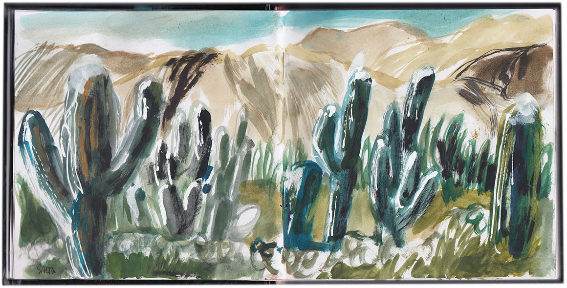 Disfrutamos del paisaje medio tumbados. Seguimos el curso del Río Grande, una vega fértil con sauces, chopos, álamos negros, fresnos y árboles de la pimienta. También huertas que aquí trabajan con pequeños tractores. Cabras, vacas, caballos y gente montada en ellos. A ambos lados montañas gigantes primero desérticas con cactus grandes como los de la Isla del Pescado, a los que llaman cardón, y con esas formas rugosas que tienen las de Guadix, y luego con dibujos geométricos de textiles. Un paisaje difícil de imaginar: montañas desnudas y de muchos colores enseñando las capas de su refajo en curvas semicirculares o en un extraño zigzag. Es la famosa Quebrada, declarada Patrimonio Cultural y Paisajístico de la Humanidad por la Unesco en el año 2003. Y en primer plano una vega repleta de verde, donde se entreven casitas de adobe recubiertas en las fachadas, cruces de un cementerio o el paseo de algún paisano con la ropa un poco más llamativa. Como la paz en tierra de nadie, entre dos imperios. Es la Puna, donde corren la vicuña, el keú andino y el ñandú, y vuelan el flamenco, la avoceta, el aguilucho y el chorlito.