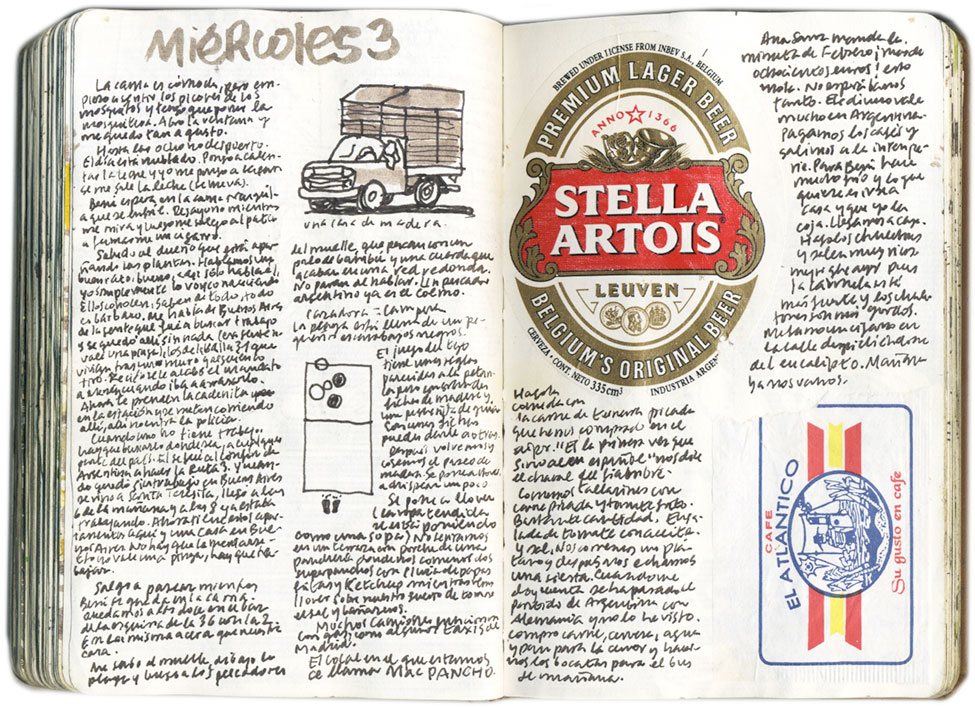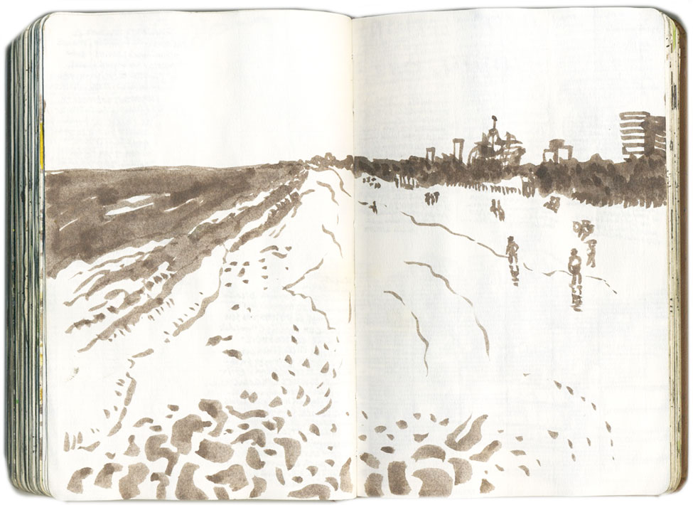 He quedado con Beni en un bar y allí está. Sacamos los boletos para mañana y nos damos un largo paseo por la playa hasta que se pone a llover. Juegan al tejo, que tiene las mismas leyes que la petanca pero se juega con grandes fichas de madera. Cuando la lluvia apreta, nos sentamos en la terraza del porche de un bar y nos jalamos dos superpanchos con lluvia de papas fritas y una cerveza Quilmes de a litro. Las camareras adolescentes se interesan por mi cuaderno y quieren saber que he dibujado en mi estadía en su bar, pero sólo terminé una playa a medio hacer.