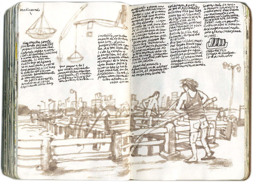 Beni se duerme otro ratito mientras yo preparo el desayuno y me voy a dar una vuelta. La carnicería El Ternero ya está a tope. Me llego hasta la plasha, ya hay gente bañándose. Subo al muelle. Están pescando con unas cañas gordas de bambú que acaban en una cuerda atada a una red semiesférica que llaman mediomundo. La cosa consiste en subirlas y bajarlas y ver que ha entrado con suerte. Buscan lisas y pejerreyes, pero sólo entran pequeñitos que también guardan. Un momento que acaba de caer un pejerrey blanco plata agitándose con sus ojillos negros. Cuentan que el agua está sucia porque el viento viene del Este, pero cualquiera se cree algo por aquí. Hay un brasas que no para de machacar que hay que tener mucha pasieeensia, el otro día pescaaando el sooolo, shegó un looco que quería mataaarme por un pez.. Pero hoy jueeega Argentiiina con Alemanía viste? Ahora se dice Maneg, no Munich… sí, juega Palermo pero en el baaanco… me mira para ver qué digo, pero yo me mantengo en el más absoluto silencio, no pienso entrar en esa tortura. Enseguida entra otro charlatán y los dos se auto complacen mientras hago mutis. Ellos siguen con la caña y la red, y la boquita dale que te pego.