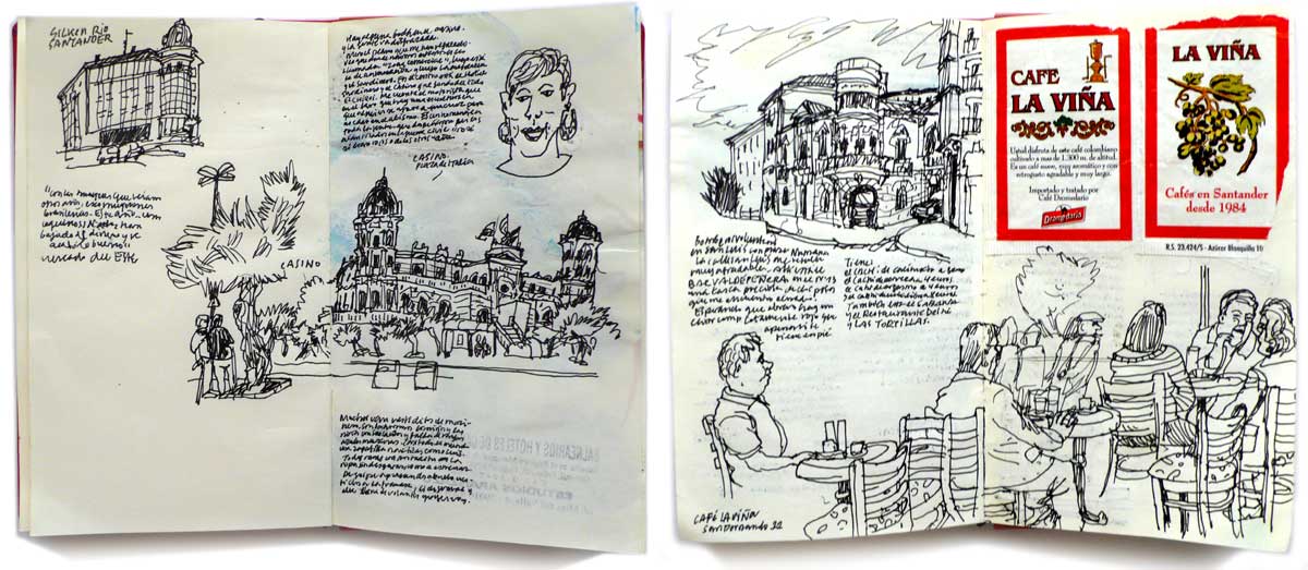 Mientras los chicos duermen, doy un paseo por Santander, de la que tengo una idea prejuiciosa de pijota, de mucho paseo para ver y ser visto. En el Café La Viña muchos abuelos de punta en blanco. Dibujo el edificio de los bomberos, mientras un señor con casco y sin ganas de volver a casa me cuenta historias de la villa. Me meto por San Luis, donde quedan algunos fósiles como el Bar Valdepeñera, que abre en diez minutos. Un señor completamente rojo y a punto de volcar, espera impaciente. La rancia biblioteca Menéndez Pelayo, el Museo de Arte Moderno y Contemporáneo con las paredes abarrotadas de fotos y cuadros. El habanero Adrian Melis trata de hacer productivo el sistema improductivo rescatando los sueños de los que se duermen trabajando: Tenía un hija con mi jefa, ella me dice que tengo que mantenerla o nos echarán a los dos. Siempre me quedo dormido en el tractor. Las computadoras caminaban. Compré un vestido nuevo que me envolvían en una caja de cartón.