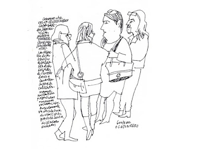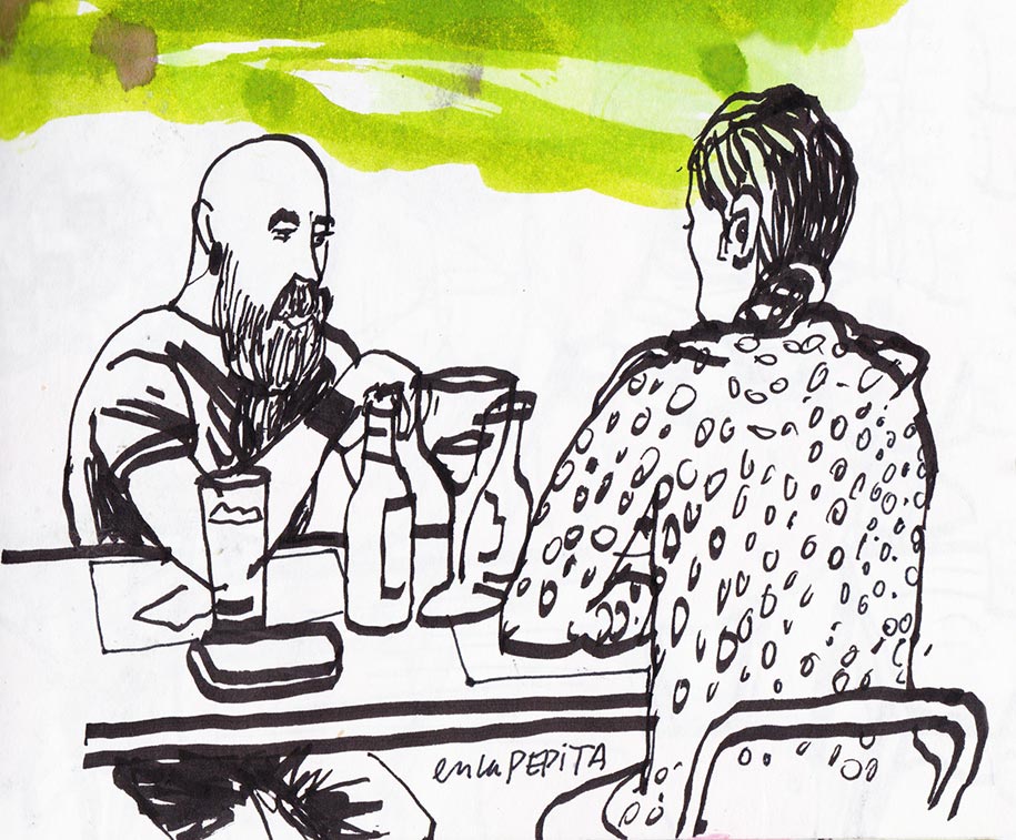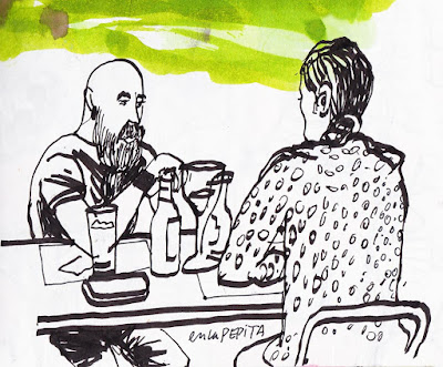 No me gustaron las tapas del Bar Central, con el sospechoso adobo del pincho moruno, pero sí ver por allí a los cuadernistas Ana, Giorgina, con su cara triangular, y Pepe el de Granada (en la mesa que dibujé en primer plano).