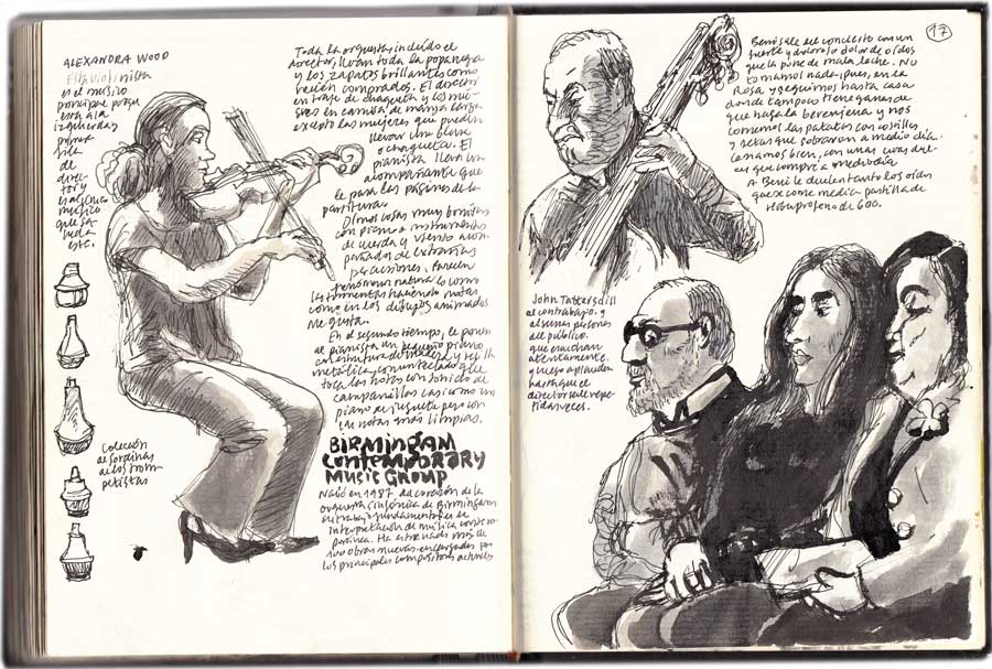 Es un difícil y bonito trabajo que suelen publicarle en el Heraldo de Aragón. Yo hice algo parecido durante un tiempo en los conciertos de música contemporánea que, los lunes tarde, daban en el auditorio del Reina Sofía. No es tan fácil como dibujar sobre la mesa de un bar.
