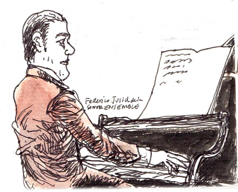 Este ingeniero de minas no se pierde ni un concierto en Zaragoza. Allí se pone a dibujar de una forma frenética (me imagino) sobre los programas, olvidando el mundo y las malas condiciones de luz. Tiene cierta obsesión por atrapar la música, y esto genera una energía de la que disfrutamos los demás.