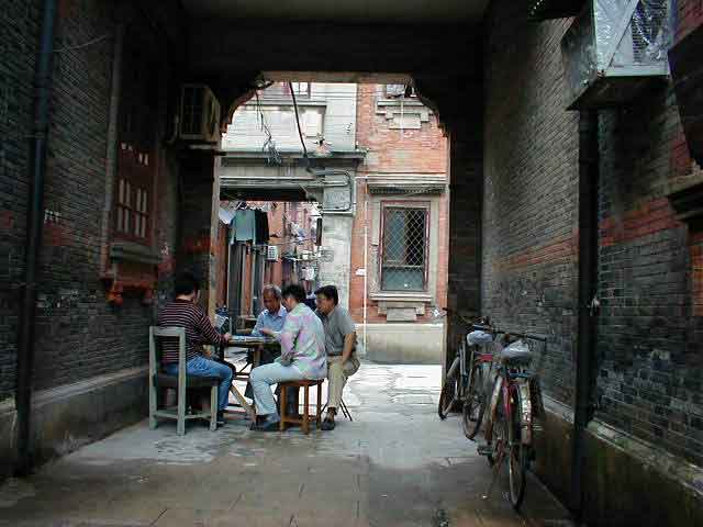 La residencia de Sun Yat Sen, de los años treinta, es simple y bonita, con mucha madera y chimeneas. Librerías acristaladas albergan fotos de los cantos de los libros originales. También subimos al edificio de la sede del I Congreso Nacional del PCC. Y, al fin, la Ciudad Antigua, nuestra idea arraigada de la China milenaria. Edificios de madera con tejados de teja negra del revés con la terminación de sus aristas en una curva ascendente, donde corretean distintos animales. Mucha gente. El árbol de los deseos, en cuyas ramas enroscan una cinta roja atada a una moneda con agujero cuadrado en el centro. Canales con puentes en zigzag que llegan a un estanque, en cuyo centro hay una pagoda con perros en las aristas de los tejados. Es un salón de té, donde nos acomodamos. Hay tes de todo tipo de flores. Nos recomiendan de jazmín y crisantemo, el primero mucho más sabroso. Las teteras de cristal llevan la flor dentro con agua , que un señor va rellenando. También ponen unas tapas: huevos medianos cocidos con sal y alguna hierba, una hoja verde rellena y caramelos como aceitunas pasas con un hueso dulce.