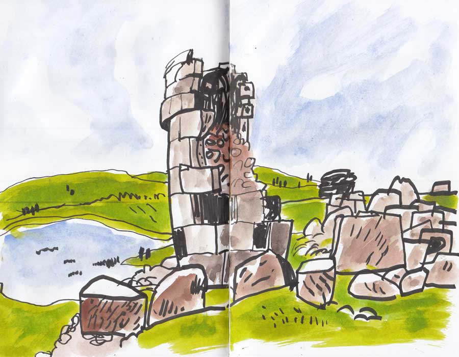 Cuando llegamos a Sillustani, nos sorprende que todo sea tan bonito: el paisaje verde, el pueblo de adobe y calamina a la orilla del lago, donde están lavando la ropa, y las colinas verdes sembradas de piedras redondas, donde se ven las siluetas de lo que venimos buscando: las torres funerarias collas. Son unos enterramientos en torres cilíndricas sobre cimientos incas, con más diámetro en la parte superior. Se metían las momias por la puerta inferior y se tapaba todo, hasta lodar la torre, con piedras y tierra arcillosa. Había momias de niños pequeños y cuyes. Al subir vemos que es una montaña que forma una península en el lago Umayo, convirtiéndolo en un sitio muy especial, realmente bello. Todos los alrededores están llenos de torres más o menos completas y algunos círculos espirituales incas. Son los únicos restos de la cultura Colla.