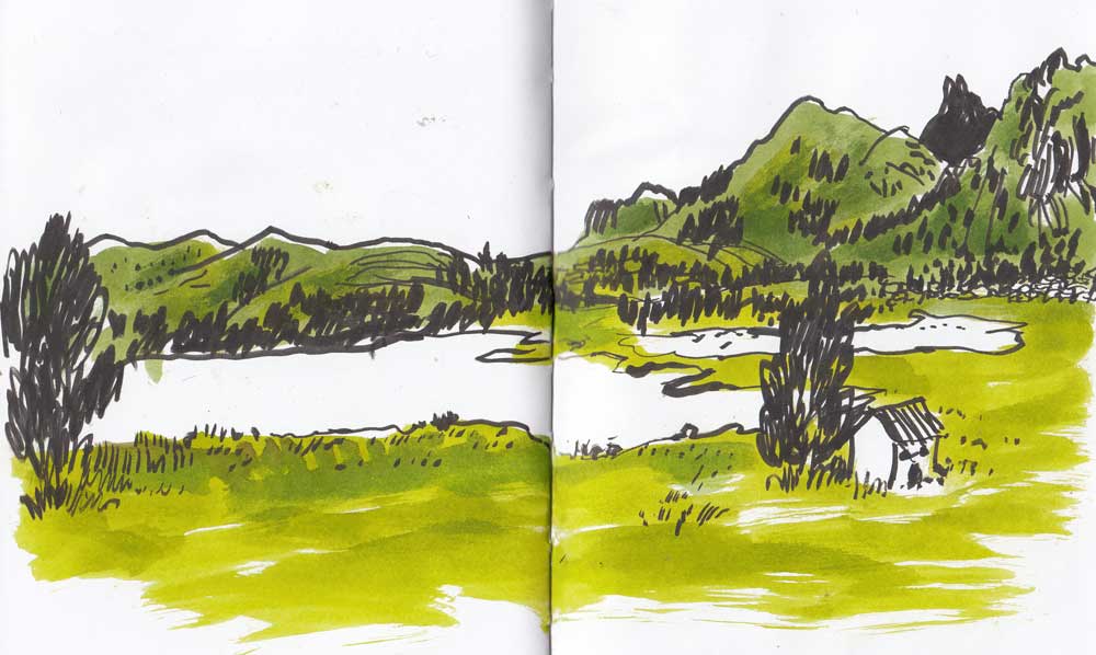 Copacabana brilla con el sol, que siluetea en el lago patinetes, barcos, canoas, muelles de madera y palos. Produce paz mirar el lago con esa luz. Nos sentamos enfrente con una Paceña en una terraza y esperamos que aparezcan rojos y amarillos entre las nubes y luego sólo grises en el agua de mercurio y el resto negro. Hago un dibujo feo y hortera como todas las puestas que quieren representarse. Mejor sólo estar. Disfrutar y nada más.