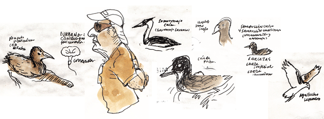 agua de mala calidad de las depuradoras de varios pueblos, especialmente de Alcázar de San Juan, de gran tamaño, hace que sea difícil ver las especies que necesitan agua transparente (como la nutria y algunos ánades) y que en algunos sitios huela mal. Hacemos el circuito amarillo (no se puede hacer ninguno en barca) y vemos aves como garcetas, garzas imperiales y cangrejeras, fochas, somormujos, sampullines chicos y cuellilargos, golondrinas de agua, cormoranes y el aguilucho lagunero. Y otros animales como el cangrejo americano, que acabó con el nuestro (y que vino gracias a la codicia de quienes vivían de él), gambusias (introducidos para acabar con el paludismo, ya que se comen los huevos de mosquitos) y el pez gato.