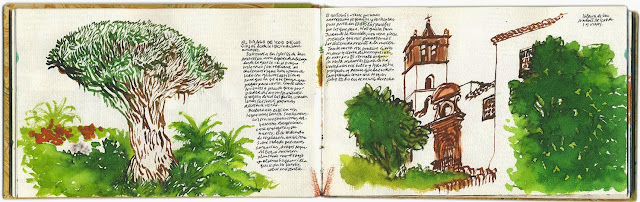 En Icod de los Vinos, subimos a la Iglesia de San Andrés, en una atalaya desde la que vemos nuestro querido y anciano drago en un barranco bien conservado sin construciones excepto una casa antigua y su huerto. Rodeado de palmeras canarias, pequeños dragos y alguna buganvilla que aporta su fuerte color magenta. Dejo de dibujar cuando la gente sale de misa. El bar está bajo el quiosco de música.
