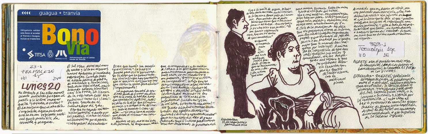 Me levanto muy temprano y, mientras Beni duerme, desayuno en la estación de guaguas, en su bar sucio lleno de trastos. Veo llegar las guaguas y la gente transitando. Paseo por el edificio a la cubana, del mismo color que las guaguas, subo por su escalera circular llena de meadas. La terraza es una plaza en ruinas con plantas carnosas casi secas. Un conductor trata de meter a nueve turistas en una furgoneta Berlingo. No caben ni de coña. Señores, hay que acoplarse, les dice. Subo la pequeña colina de casitas pequeñas, edificaciones redondas cuyo techo acaba en una chimenea y viviendas antiguas. Un viejo camión Fiat de Transportes Castilla.El bus recorre carreteras pequeñas y tortuosas, para en todos los pueblos. Nos gusta San Juan de la Rambla, con una plaza preciosa que nos prometemos ver a la vuelta. Nos mareamos con tanta curva. La tinta marrón se me vierte en el bolso.