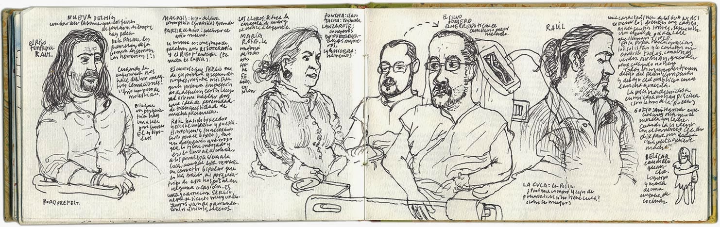 En el dibujo la familia de Sergio (para aclararme un poco): Juan Manuel lleva los tanques del aeropuerto, parece que le han dado un hachazo en la barbilla. Gloria es hermana de Yiya y de Rosa, la madre de Sergio. María José está embarazada, estudió Bellas Artes, especialista en restauración, hace cuadernos de viaje, tiene los ojos preciosos. A Carmen le gustan los nombres sonoros como Raúl y Néstor, se quedó viuda ya separada y se casó con un suizo egoísta pues le hizo perder la pensión de viudedad, es de la Iglesia Avantista.