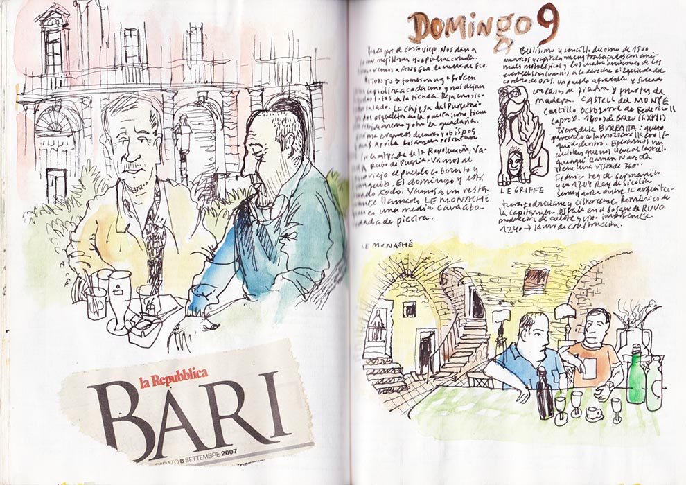 Recorremos el casco viejo de Bari. Nos invitan a mejillones crudos. Quedamos con Ángela, la novia de Franco. En Bitonto, comemos sepiolina y nos dejan hacer fotos en las tiendas. En la Chiesa del Purgatorio dos esqueletos custodian la puerta, uno tiene un reloj de arena y otro una guadaña; encima hay cráneos de curas y obispos, y más arriba ángeles rescatando almas. Bitonto es un pueblo bonito y tranquilo. Agradable y soleado, con paredes de piedra y puertas de madera. Comemos en un restaurante llamado Le Monaché, que es una cava abovedada de piedra. Bellísimo y sencillo duomo del 1500. Marcos y capiteles trabajados con animales mitológicos. A la salida, visitamos la casa de la madre de Franco, que nos confunde con una pareja de testigos de Jehová. Y luego nos canta una bellísima canción.