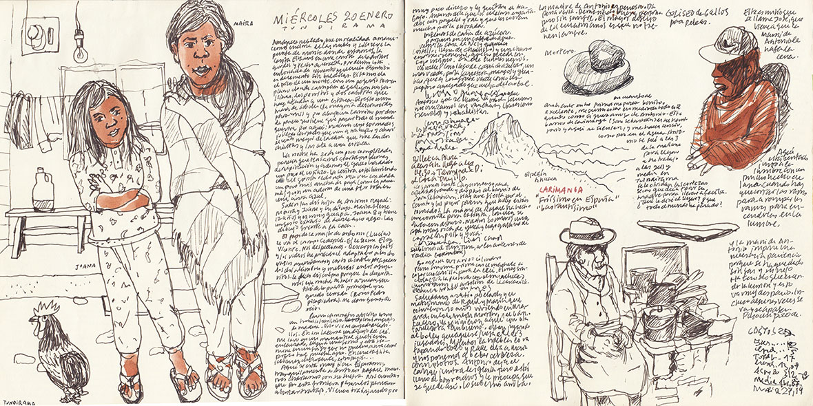 Aunque hay niebla, hace una mañana extraordinaria, me siento feliz. Dibujo a las niñas en pijama, enseguida tendrán que ir al cole. Maira es la más guapa. Tienen el pelo muy largo y las zapatillas rotas. Sale Beni y también el sol. Entre las nubes aparecen un montón de montañas. Por la cuesta sube Don José con dos cabritas, las ata a un palo. Tiene un terreno más arriba donde las lleva diariamente a pastar. Café con leche y sol. Mojamos pan dulce. Las pilas se ponen a tope.